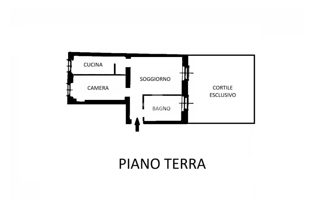 L’unità residenziale al piano terra è costituita da tre locali: ampio soggiorno con accesso al cortile ad uso esclusivo, camera da letto, cucina (con rientranza utile ad uso ripostiglio) e bagno con doccia.